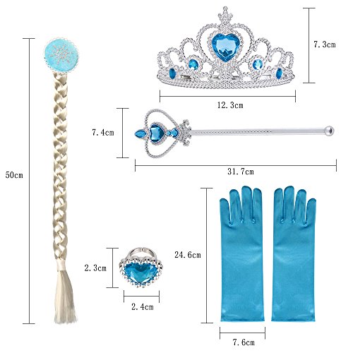 ★ Princess Dress Accessories Set Comprend: Bague,une paire (2) de gants, diadème / couronne, sceptre, tresse. Les gants sont faits de tissus élastiques spéciaux Âge recommandé pour les gants: 3-8 ans.
